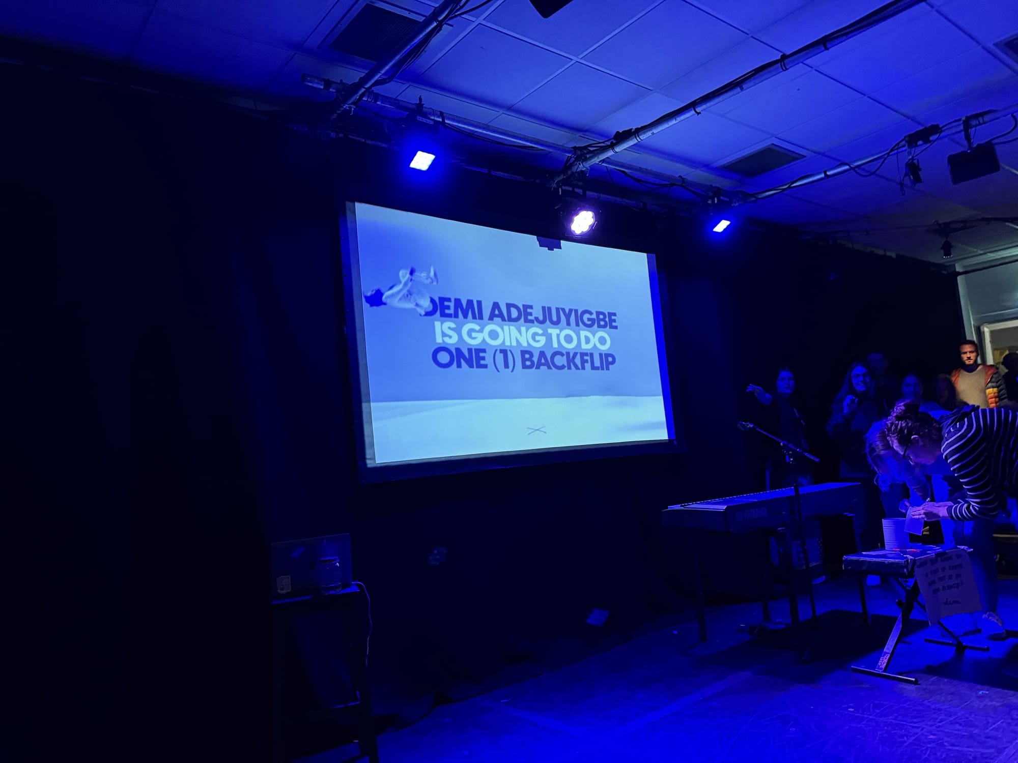 Onto the evening's entertainment: Demi Adejuyigbe's Fringe show - Demi Adejuyigbe Is Going To Do One (!) Backflip. I picked this one because I'm familiar with his 9/21 and Dropout work...